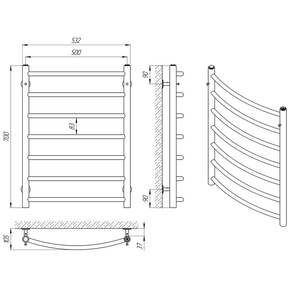 Рушникосушарка - 1 шт, кріплення (шуруп оцинкований з дюбелем, п'ятак, втулка, штифт, стійка) - 4 шт, кран Маєвського 1/2 " - 1 шт, заглушка різьбова 1/2 " - 2 шт, ковпачок декоративний - 2 шт, ключ шестигранний - 1 шт, упаковка (короб гофрокартонний, чохол поліетиленовий, чохол поліетиленовий для кріплення, короб гофрокартонний для кріплень) - 1 шт, паспорт - 1 шт.